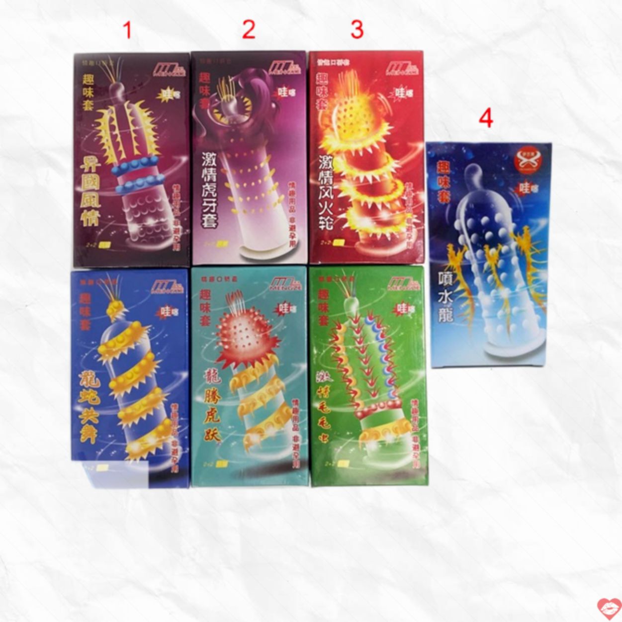 Bộ sản phẩm bao gồm 4 chiếc cao su với thiết kế đa dạng: 2 chiếc gai bi râu độc đáo tạo cảm giác kích thích tối đa, cùng 2 chiếc mỏng trơn khuyến mãi giúp bạn thay đổi trải nghiệm hoặc làm giảm sự ma sát nếu sản phẩm kích thích quá mạnh. Đây là điểm cộng tuyệt vời so với các loại bao cao su khác trên thị trường.