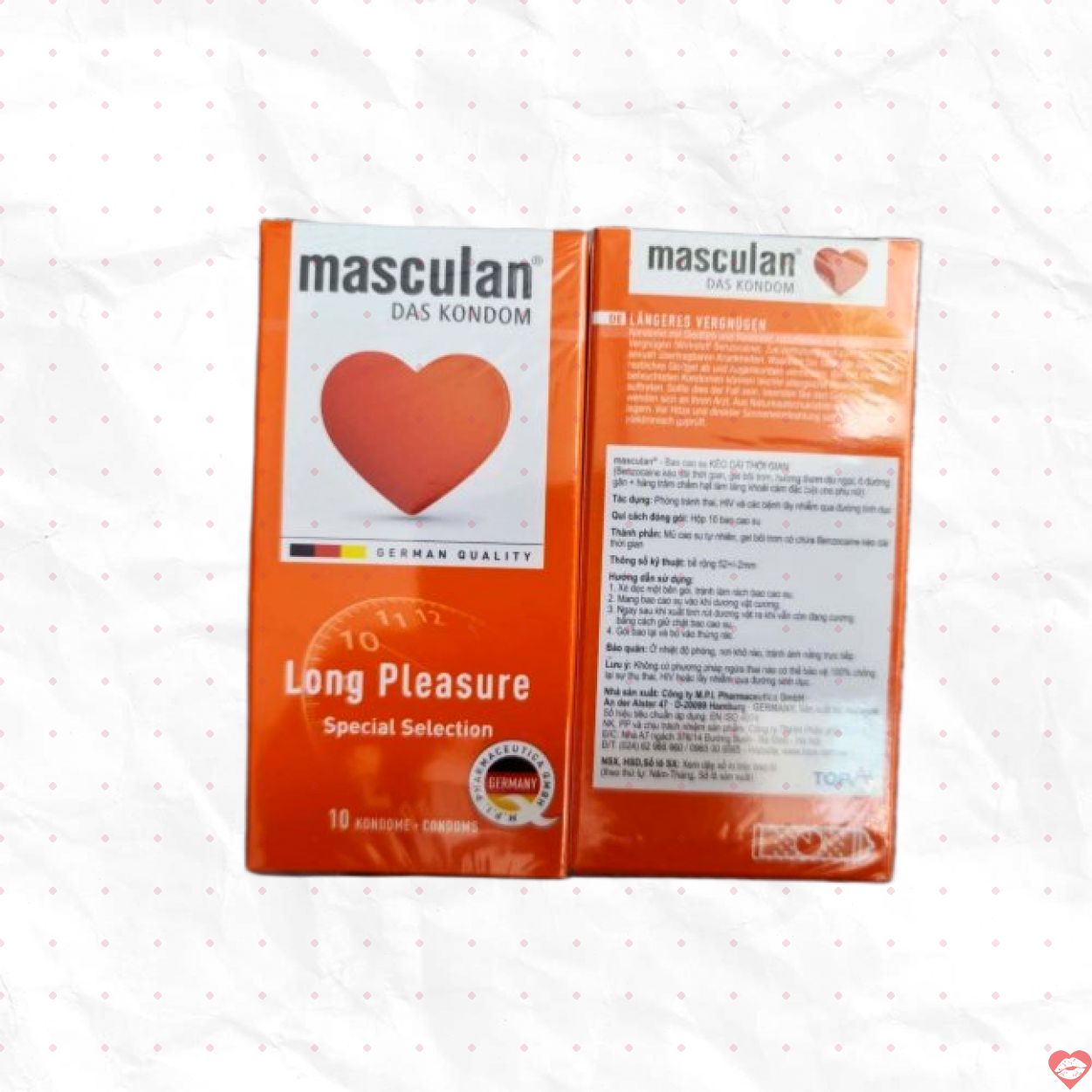 Bao cao su Masculan Long Pleasure là sản phẩm nhập khẩu chính hãng từ Đức, được thiết kế đặc biệt để kéo dài thời gian quan hệ và tăng cường cảm giác thăng hoa cho cả hai. Với sự phối hợp hoàn hảo giữa chất liệu cao cấp và công nghệ hiện đại, sản phẩm là lựa chọn tuyệt vời dành cho những ai muốn duy trì khoảnh khắc đỉnh cao lâu hơn trong chuyện phòng the.