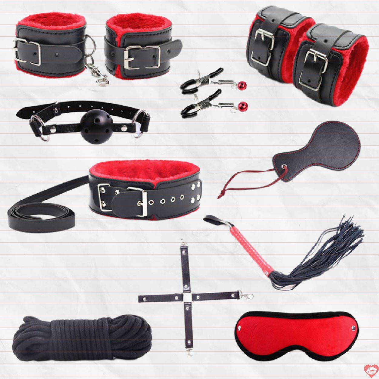 Quy cách đóng gói: Gồm 10 món bao gồm khóa tay, khóa chân, khóa cổ, khóa hàm, kẹp ngực, roi da, phết mông, bịt mắt, dây trói và khóa tay chân