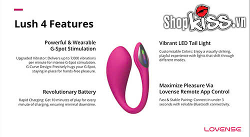 Mỗi chi tiết trên Lovense Lush 4 đều được chăm chút tỉ mỉ từ lớp silicone mịn màng cho đến động cơ rung mạnh mẽ và êm ái. Việc điều khiển từ xa qua app không chỉ đơn giản mà còn mang đến sự mới mẻ, giúp bạn hoặc đối tác dễ dàng tạo nên những phút giây thăng hoa hơn bao giờ hết. Đèn led nhiều màu tích hợp càng làm tăng thêm sự hấp dẫn và cá tính cho sản phẩm.